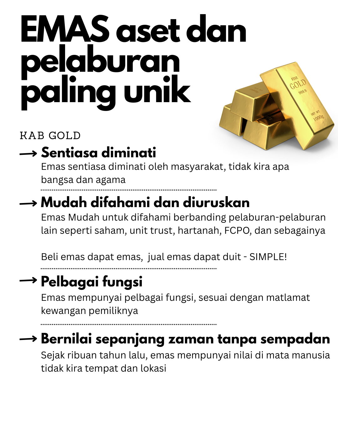 Emas Mudah untuk difahami berbanding pelaburan-pelaburan lain seperti saham, unit trust, hartanah, FCPO, dan sebagainya